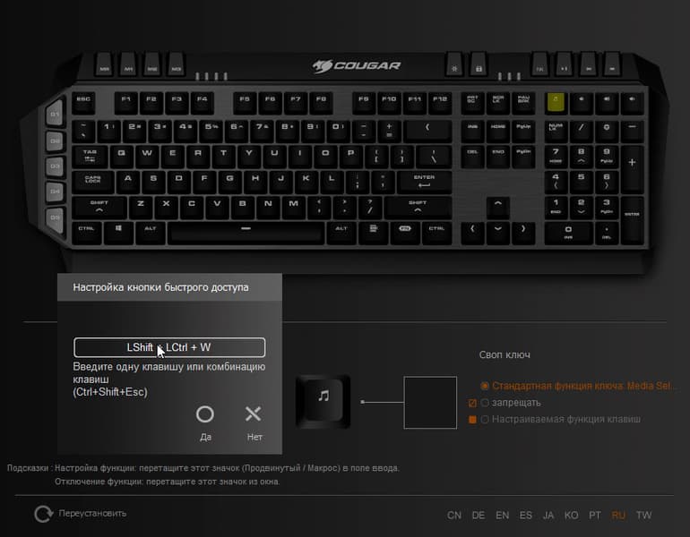 Перепрограммировать можно почти любую клавишу. Исключения составляют клавиши, расположенные в двух верхних блоках, а также клавиша Fn. Разрешенным кнопкам можно присвоить любое клавиатурное сочетание.