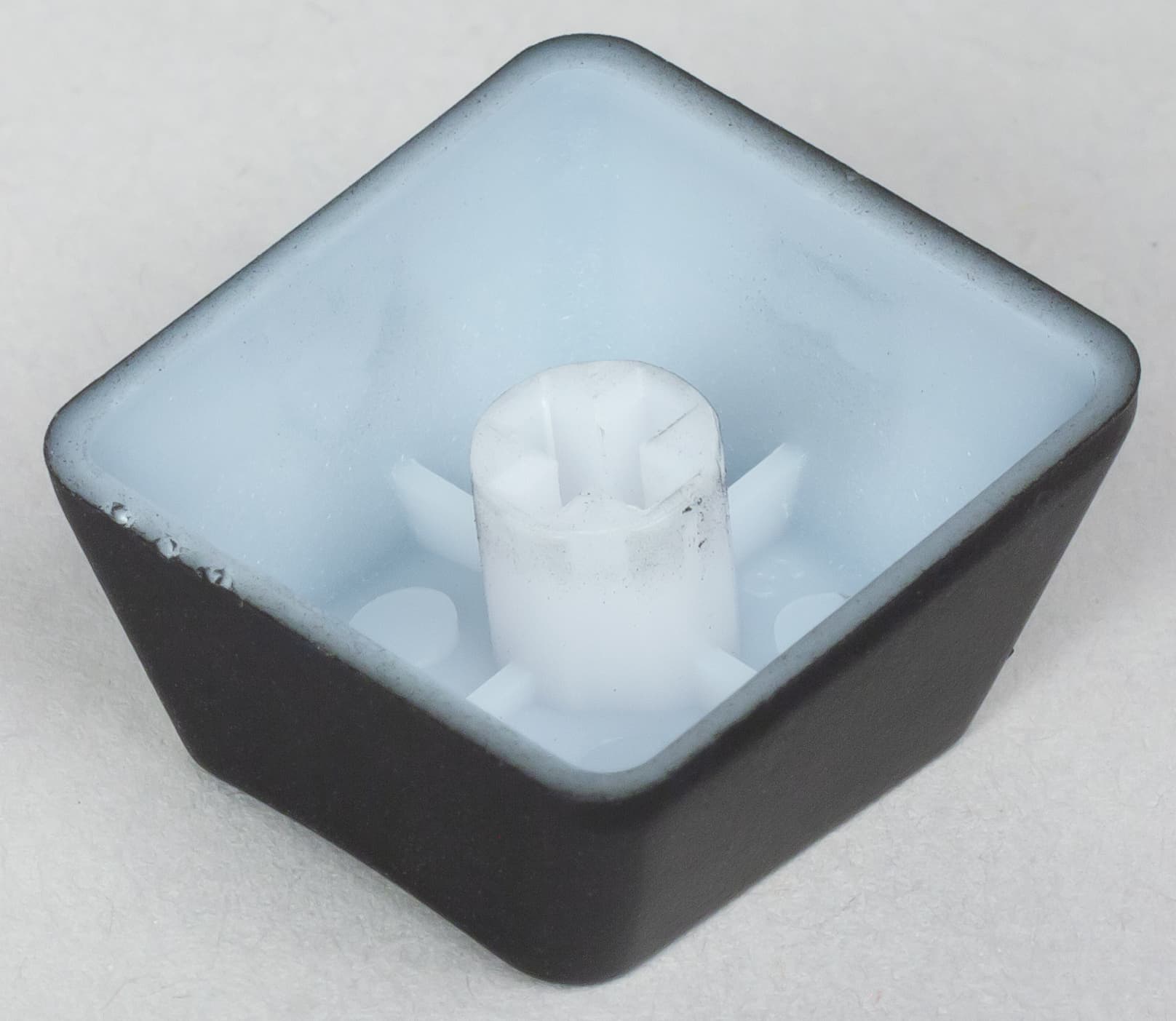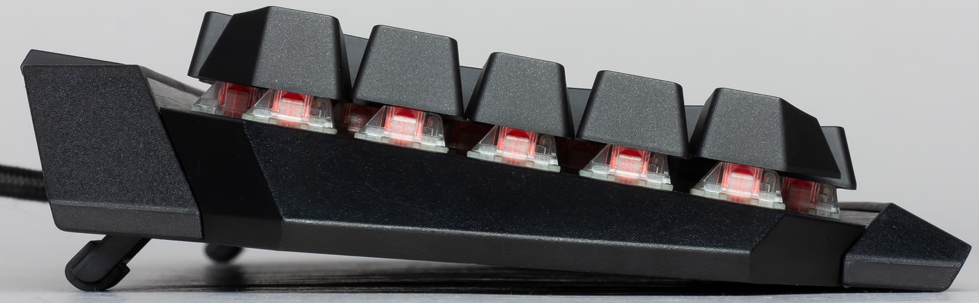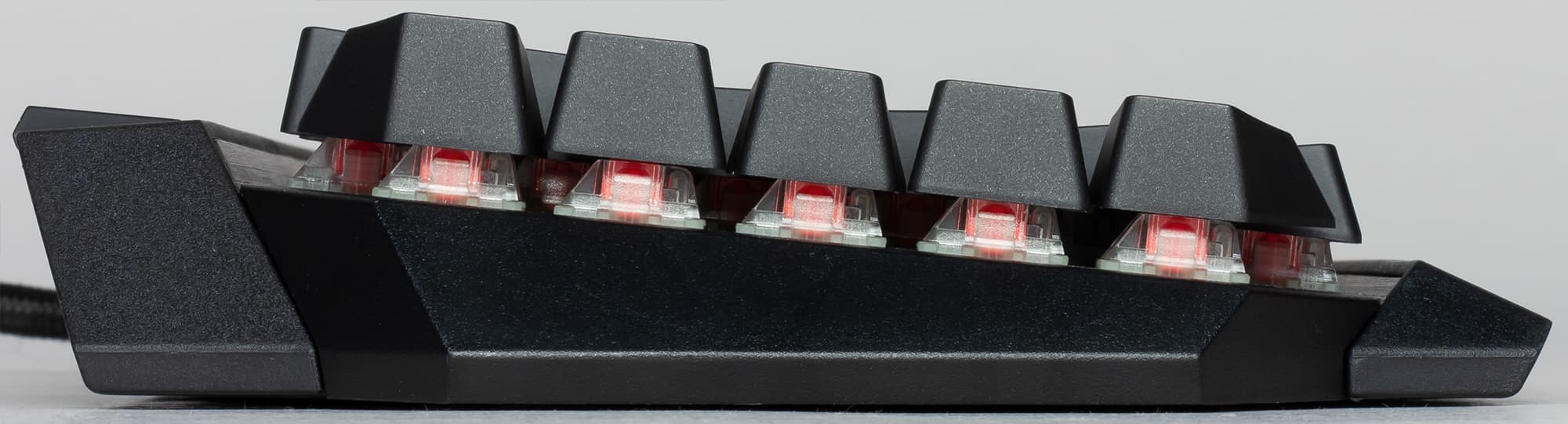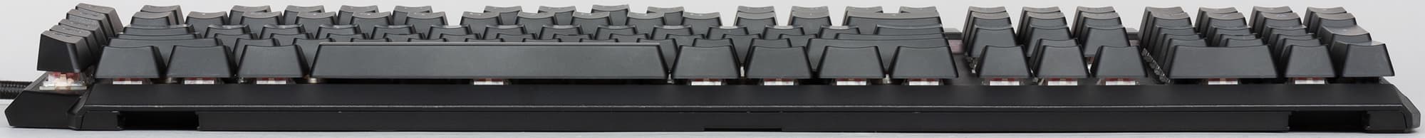 Точка срабатывания контакта переключателя находится примерно в 2 мм от состояния покоя, а общий ход клавиши составляет 4 мм. RGB-светодиод вмонтирован в верхнюю часть переключателя, поэтому символы на клавишах так «задраны» вверх.