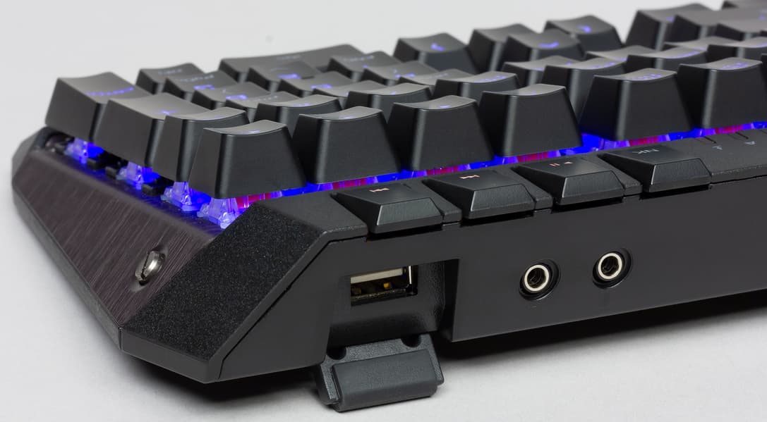 В торец корпуса клавиатуры вмонтированы три разъема. USB 2.0 служит не только для подзарядки гаджетов, но и, благодаря наличию информационной шины, для полноценной связи с ними. Правее от USB расположены выход на наушники и микрофонный вход для подключения гарнитуры или отдельных аудиоустройств, наушников/динамиков и микрофона.