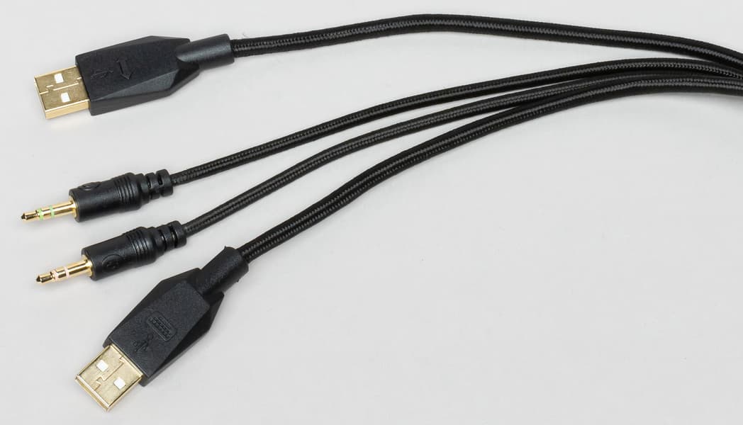 Но все эти разъемы будут совершенно бесполезны, если клавиатура не подключена к соответствующим портам компьютера. Для этого на конце ее толстого в оплетке кабеля имеются соответствующие коннекторы, дополнительный USB и два аудиоштекера. Все они обозначены соответствующими иконками, ошибиться невозможно.