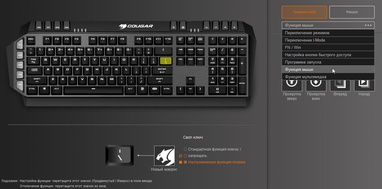 Также кнопкам присваиваются готовые и редактируемые сценарии, которые находятся в выпадающем списке блока Продвинутый. Здесь доступны такие функции, как переключение режимов, кнопки быстрого доступа, запуск программ, движение курсора мыши и мультимедийные команды. Назначение функций производится простым перетаскиванием иконок макросов.