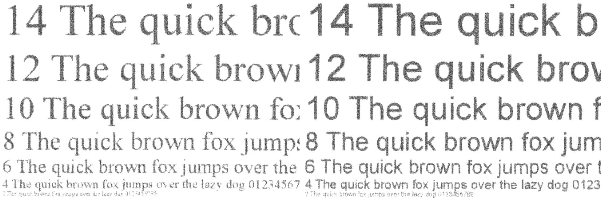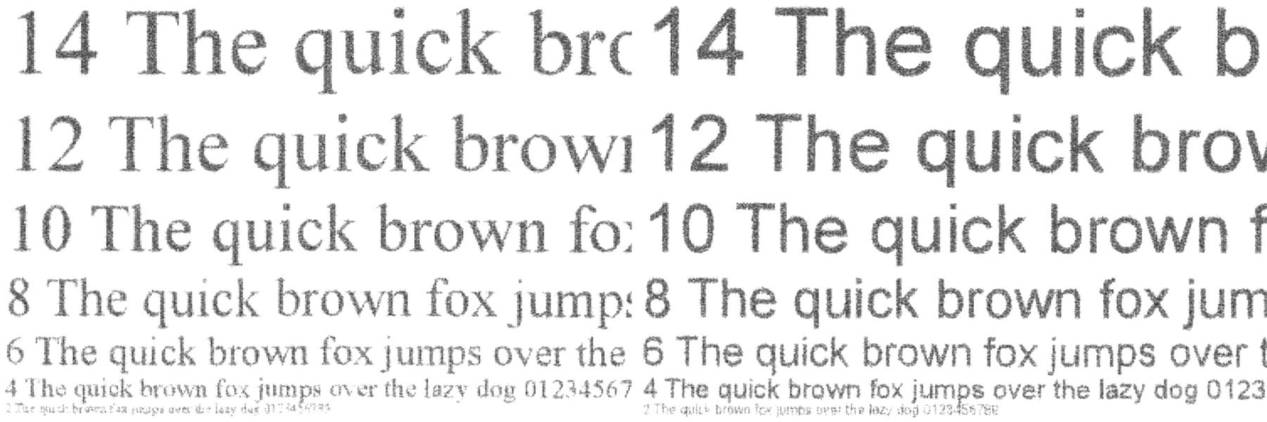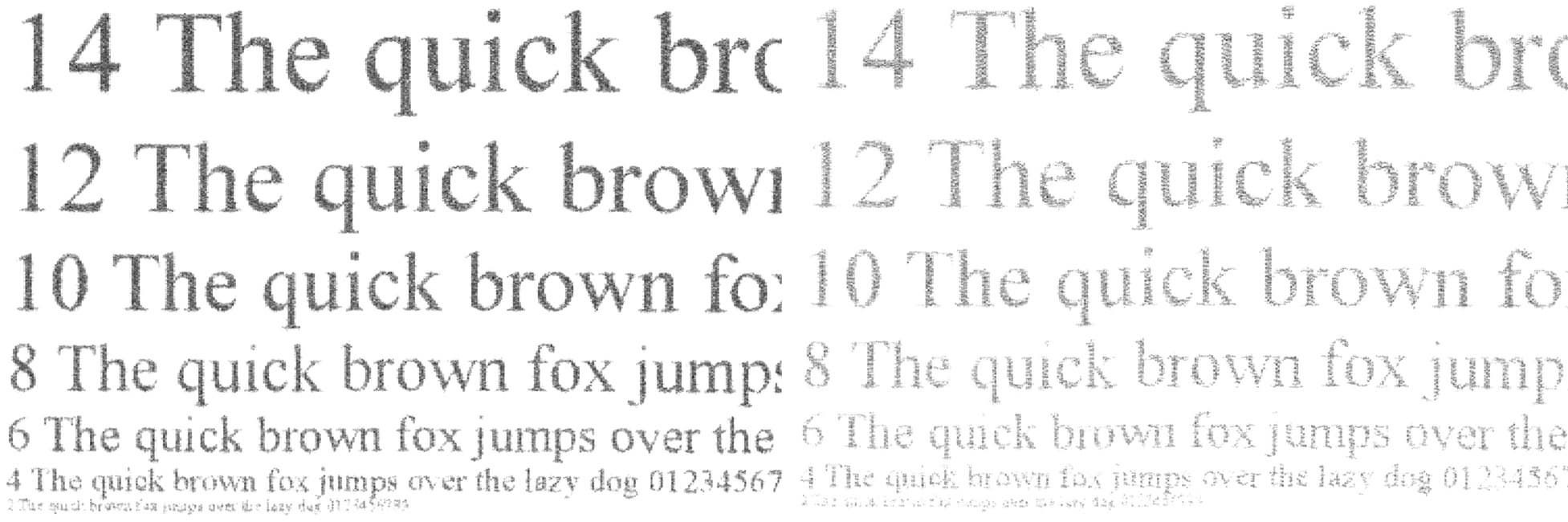 На копиях в режиме «Text» и при среднем значении Density заливка тоже получается немного бледной, но это можно поправить регулировкой плотности; шрифты читаются с 4-го кегля без засечек и с 6-го с засечками (на оригинале отчетливо различимы шрифты 2-го кегля). Установка режима «Image» увеличивает плотность и делает контуры букв более четкими, позволяя читать и 4-й кегль с засечками, но при этом скорость также снижается весьма существенно.