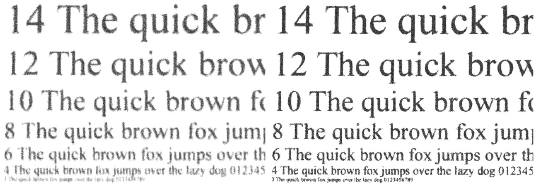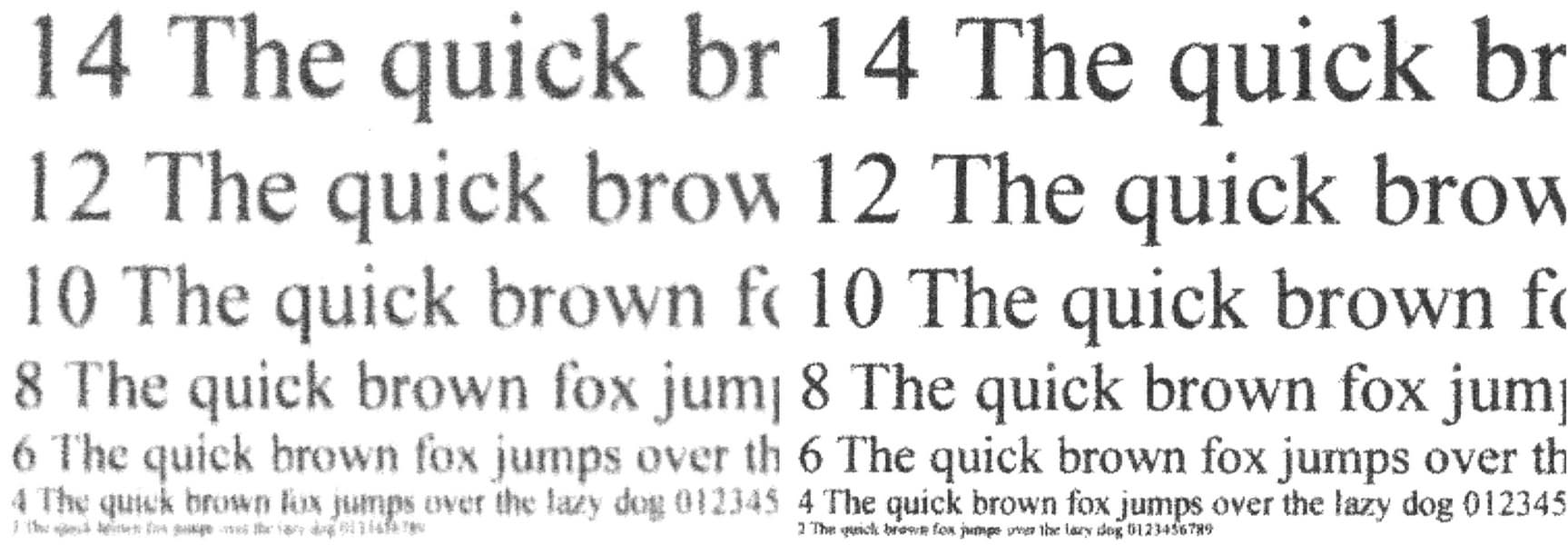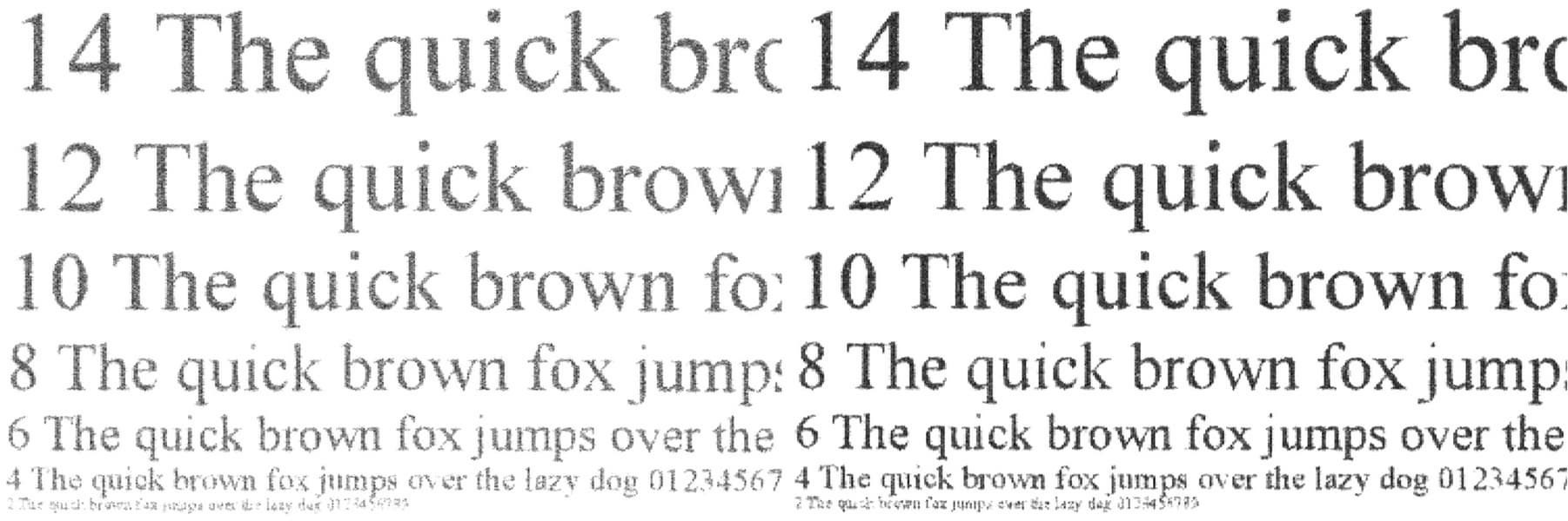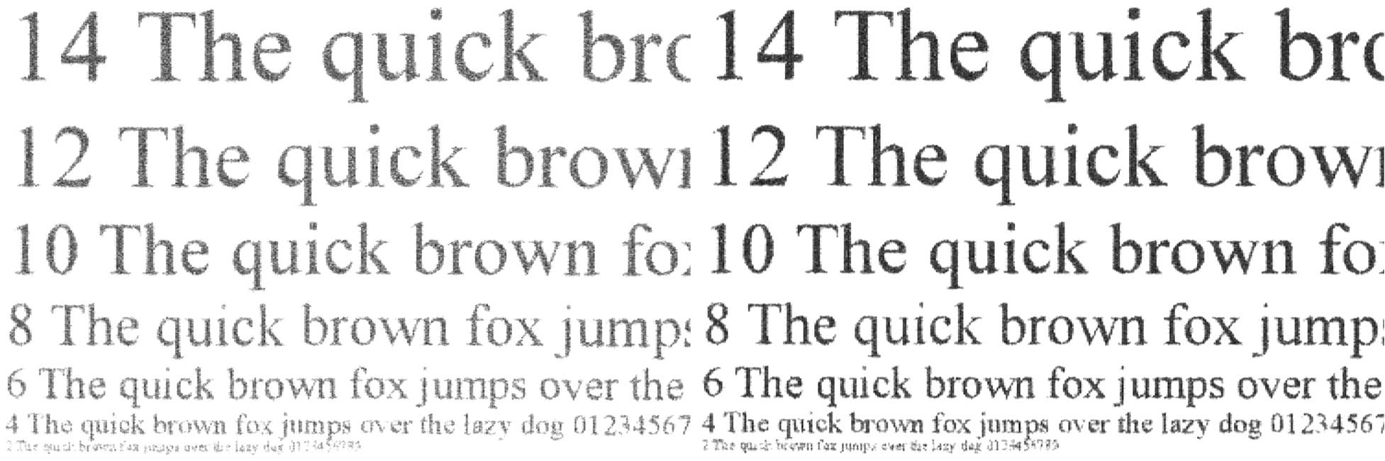 На копиях в режиме «Text» и при среднем значении Density заливка тоже получается немного бледной, но это можно поправить регулировкой плотности; шрифты читаются с 4-го кегля без засечек и с 6-го с засечками (на оригинале отчетливо различимы шрифты 2-го кегля). Установка режима «Image» увеличивает плотность и делает контуры букв более четкими, позволяя читать и 4-й кегль с засечками, но при этом скорость также снижается весьма существенно.