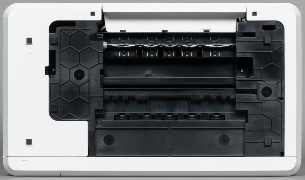 Подающий лоток расположен сзади, его крышка состоит из двух сегментов, которые выдвигаются вверх и откидываются на угол около 20-25 градусов от вертикали; такая конфигурация вполне стандартна для подобных струйных принтеров. Он рассчитан на 120 листов с плотностью 70 г/м², то есть немного меньшей, чем у обычно используемой в нашей стране офисной бумаги, которой помещается около ста листов, и это тоже привычно по многим побывавшим у нас аппаратам данного класса.