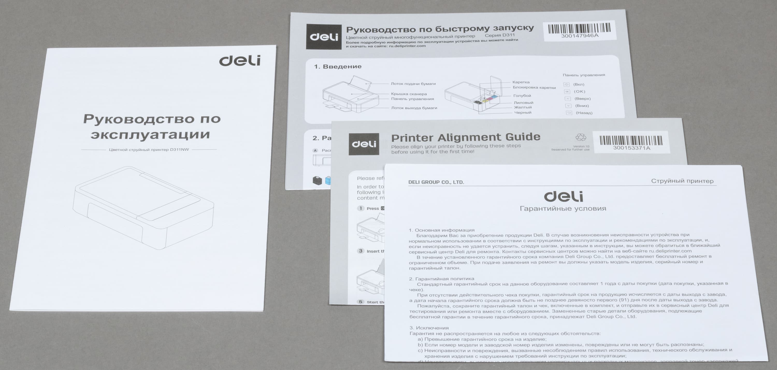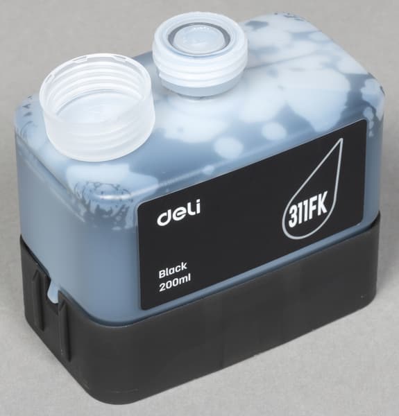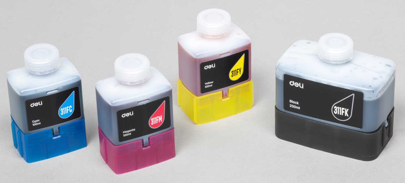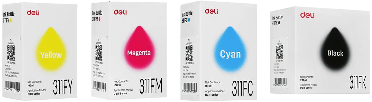 - контейнеры с чернилами (Ink Tank), обозначение Deli 311F с добавлением буквы для цвета: K для Black, C для Cyan, M для Magenta и Y для Yellow; указанный в русскоязычном разделе ресурс — по 8 тысяч отпечатков, а обозначенная на самих контейнерах емкость разная: для 311FK — 200 мл, для цветных — по 100 мл; такие поставляются в комплекте и предлагаются в рознице
