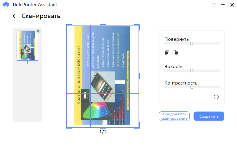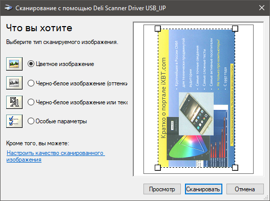 Поскольку автоподатчика в МФУ нет, вариант для сканирования единственный — со стекла. Его мы опробовали при двух вариантах подключения (сканирование по Ethernet невозможно), замер времени от нажатия кнопки «Начать сканирование» в утилите Deli Printer Assistant до появления скана в ее окне, по два замера с усреднением.