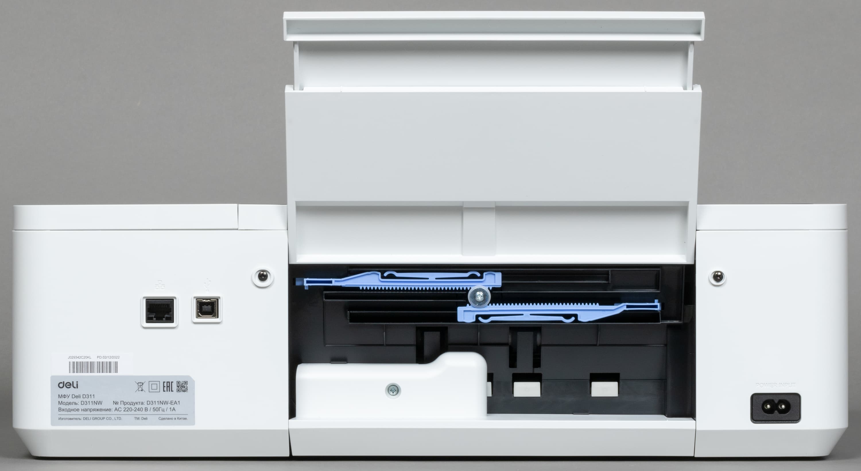 В струйных принтерах также имеется абсорбер (или «памперс») — устройство сбора чернил, вытекающих из головок, например, во время их прочистки соответствующими сервисными процедурами. Его тоже время от времени надо заменять, но в очень многих моделях эту процедуру относят исключительно к компетенции авторизованных сервисных центров — похоже, так дело обстоит и в Deli D311NW: абсорбер в инструкции не упоминается, отдельного сообщения о его переполнении нет, есть лишь ошибка общего плана, при появлении которой следует обратиться в СЦ.