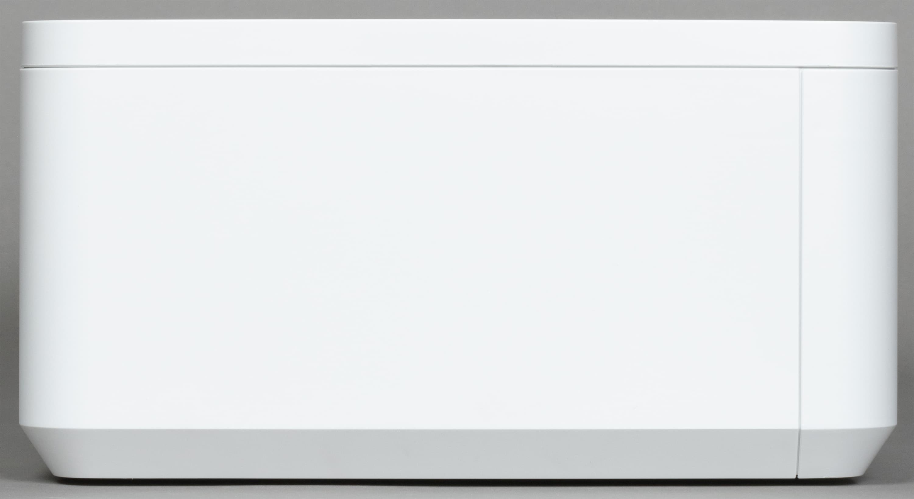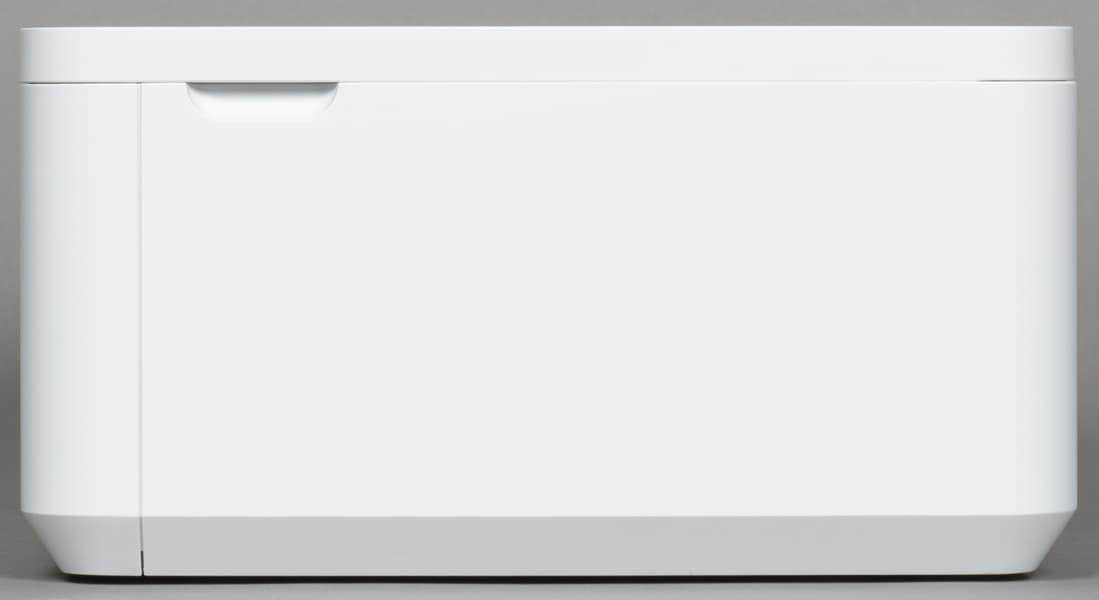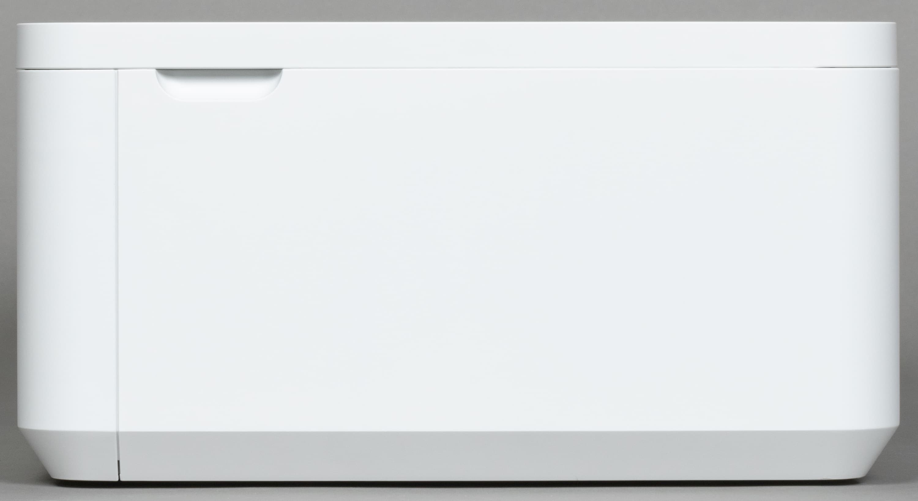 Внешне аппарат похож на невысокий брусок с сильно скругленными вертикальными гранями и заметными скосами у нижней кромки. Корпус молочно-белый, крышка сканера и панель управления черные. Все эти поверхности матовые, отпечатки рук на них будут заметны мало, но пыль с черного верха придется удалять почаще.