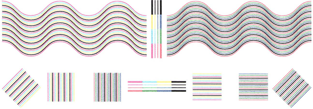 Совмещение цветов по вертикали и по горизонтали очень точное (незадолго до теста проведена калибровка), тонкие линии воспроизводятся хорошо, без заметных даже при увеличении разрывов и ступенек, на тонких изогнутых линиях нет перетеканий и ступенек (конечно, с точностью до пористой структуры бумаги, которая сказывается на таких мелких деталях).