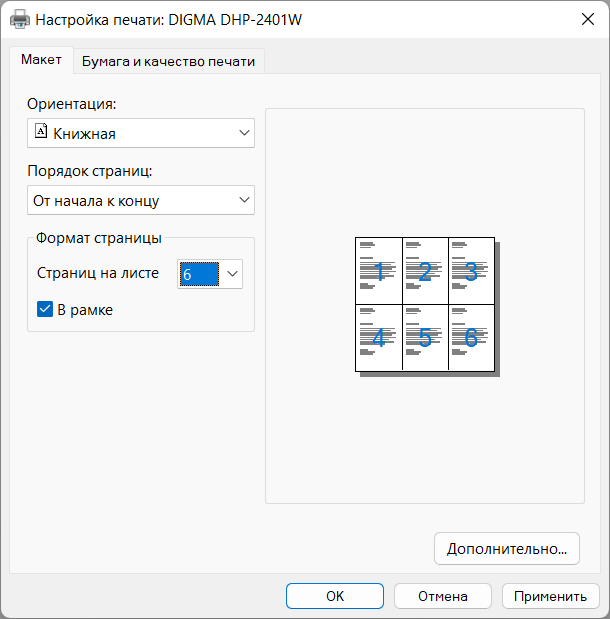 На первой закладке основного окна задаются: ориентация, порядок вывода страниц многостраничных документов, также можно размещать от 2 до 16 уменьшенных страниц на одном листе (кому и зачем нужны 16 картинок, на которых ничего нельзя разобрать — вопрос отдельный, но подобная функция у печатающих устройств встречается часто).