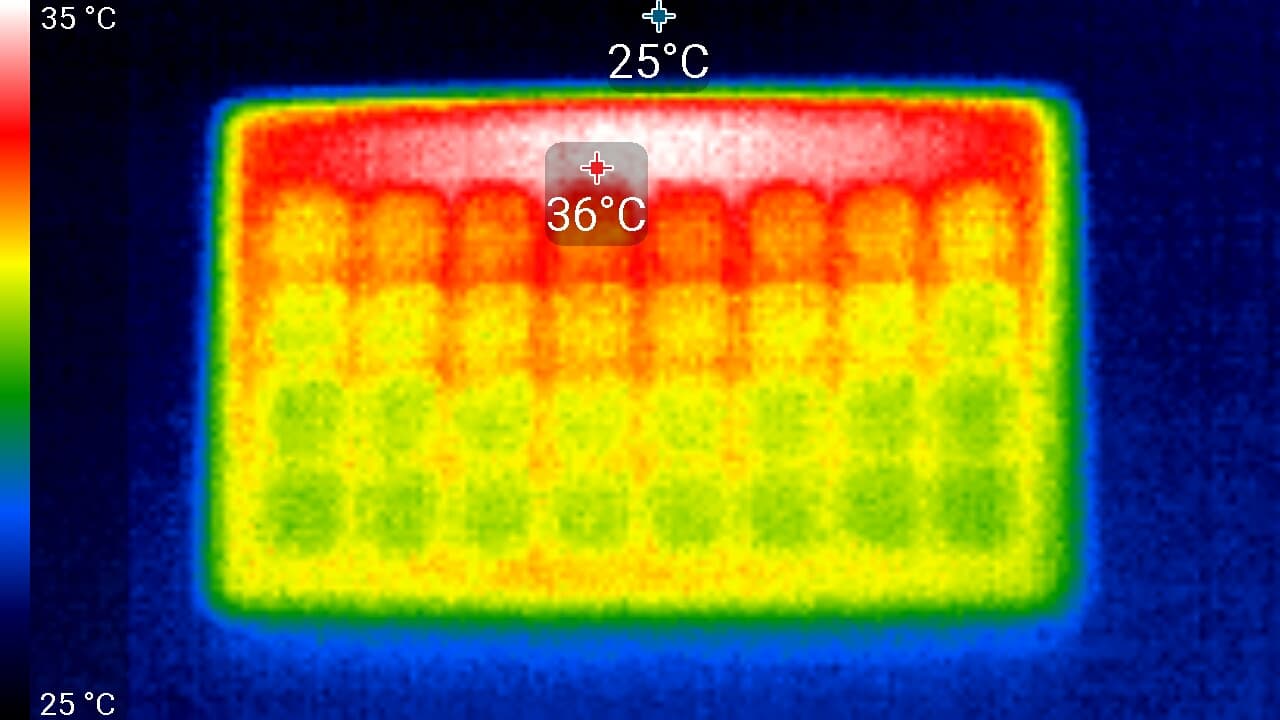 Кстати, съемка с такого ракурса показывает, что при нажатии на кнопку она немного утапливается, но изображение под кнопкой остается на месте. Что это означает? Логика подсказывает, что никаких 32 маленьких экранчиков здесь нет, а есть один большой дисплей. Заглянуть внутрь не позволяют условия предоставления оборудования, согласно которым мы обязаны вернуть изделие в товарном виде. Однако никто не запрещал использовать другие способы исследовать внутренности. Например, тепловизионную съемку.