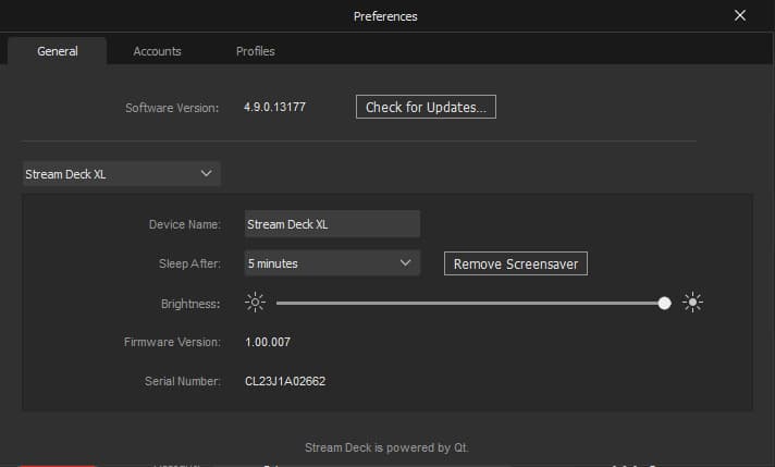 Теперь о системных (не кнопочных) настройках Stream Deck. В них, помимо добавления аккаунтов, есть возможность активации заставки, которая будет отображаться в «полноэкранном» режиме после определенного времени простоя, а также возможность создания новых профилей.