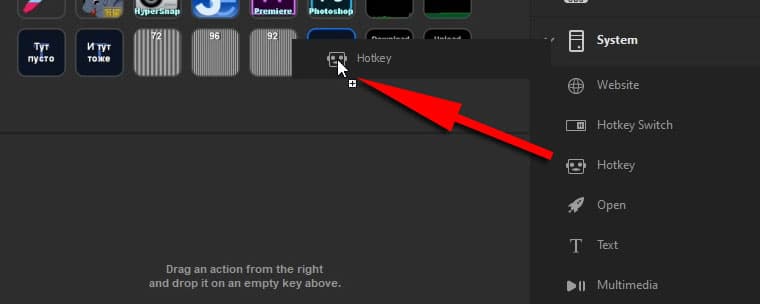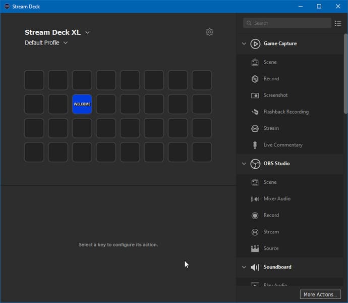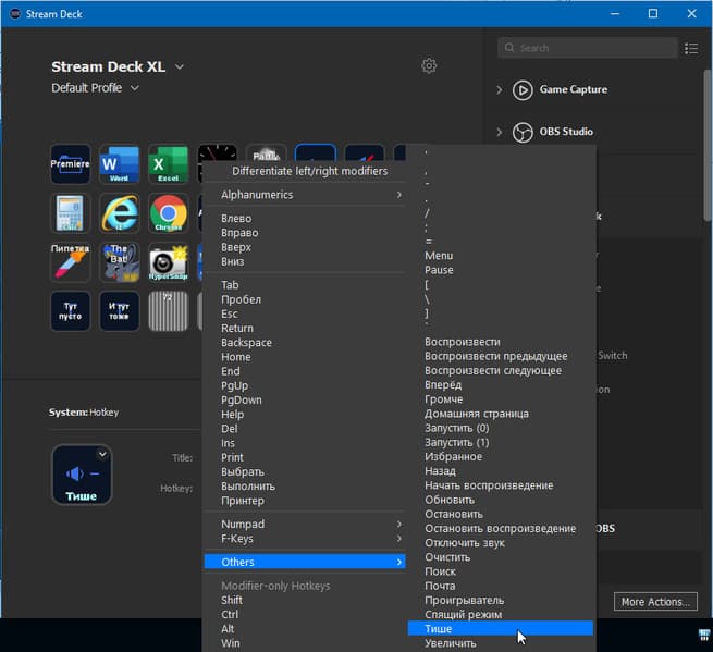 Переназначение кнопок контроллера под свои нужды производится в конфигураторе Stream Deck. Он состоит из трех частей: виртуальный контроллер Stream Deck XL с 32 кнопками, панель доступных опций справа и модуль с настройками каждой опции внизу.