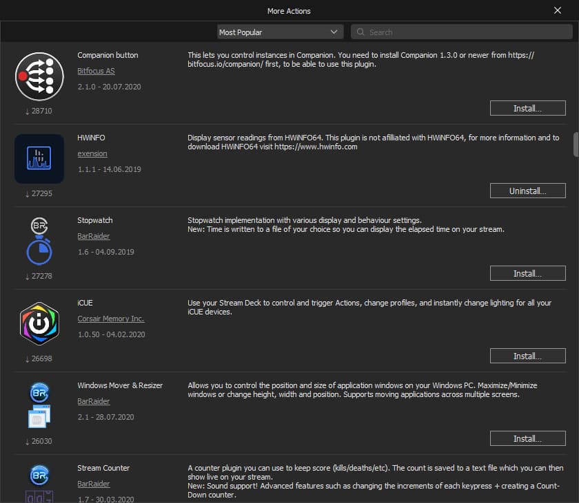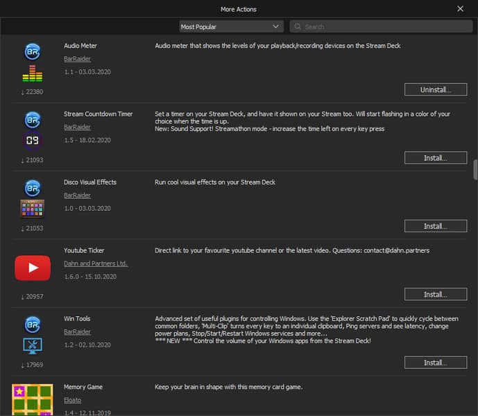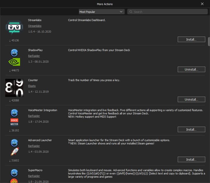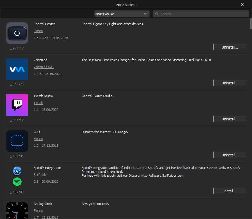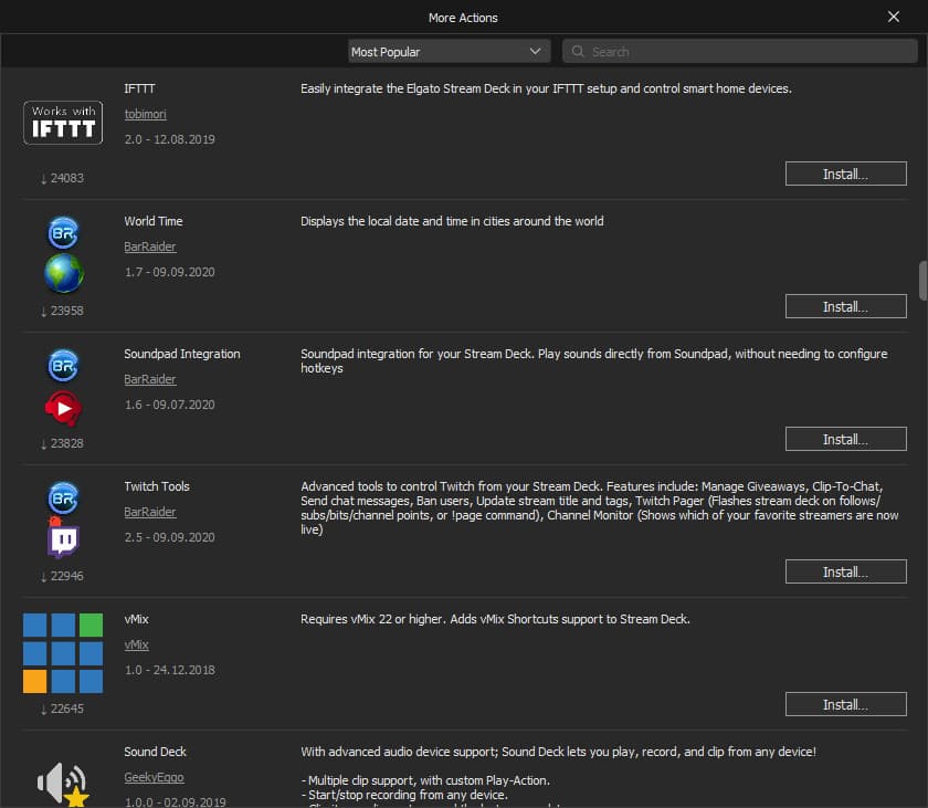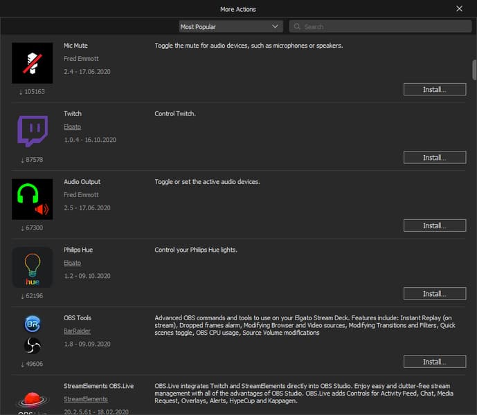 Расширить функциональность нашего контроллера (куда уж больше-то?) поможет тот самый пункт More Actions. Это копилка разномастных функций, этакий фирменный магазин приложений, только с бесплатным ассортиментом, который создается как разработчиками Elgato, так и пользователями-энтузиастами. Пока имеющийся здесь выбор «товара» не столь широк, как хотелось бы. Хотя и маленьким его не назовешь: около 90 позиций. Если кто-то из читателей обладает навыками программирования — пожалуйста, Elgato предоставляет SDK.