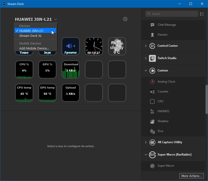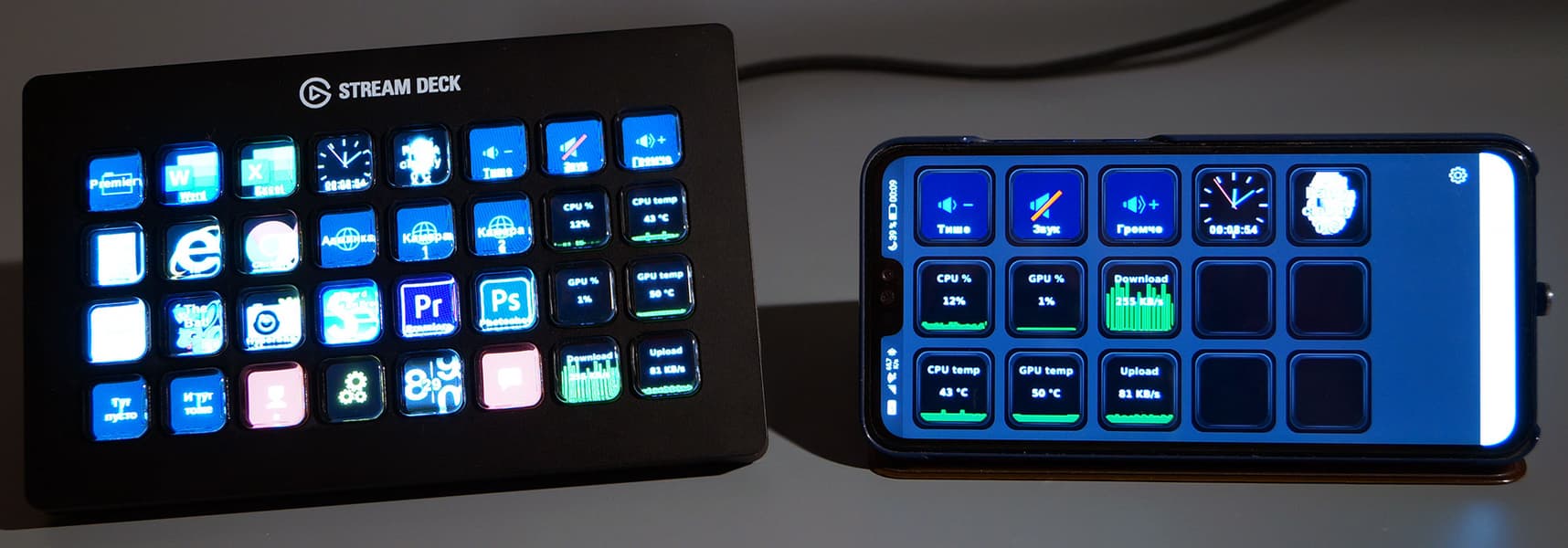 Внимательный читатель наверняка заметил в таблице характеристик контроллера упоминание о некоем мобильном приложении. Действительно, такое существует и называется Stream Deck Mobile (версия для Android, версия для iOS). Вкратце: это приложение превращает ваш смартфон в еще один контроллер. Дополнительный. Который может располагаться рядышком с реальным контроллером и работать точно так же, как он. Но при этом иметь совершенно другой набор кнопок.