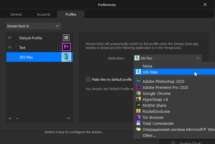 С профилями все очень интересно. Каждый профиль — это фактически еще один рабочий стол, имеющий свой набор команд (в нашем случае — кнопок). Стоит запустить программу, например 3ds max, и Stream Deck автоматически переключится в соответствующий профиль. В котором, как вы уже поняли, имеется созданный заранее набор кнопок для работы именно в 3ds max (операции, выбор инструмента, клавиатурные сокращения, макросы и т. д.).