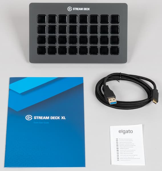 Вместе с панелью Stream Deck XL в упаковке имеется полутораметровый кабель с коннекторами USB-C — USB-A, подставка с магнитными фиксаторами и мультиязычное краткое руководство (русский язык присутствует).