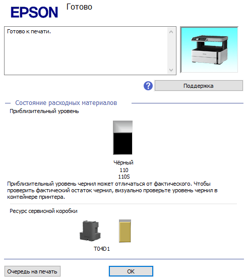 Там же приведен и код оригинального абсорбера — T04D1 (артикул C13T04D100). Есть и немного двусмысленная фраза «Пользователь может приобрести ...»: на странице с перечнем расходных материалов для M2140 официального сайта во время написания обзора абсорбера не было, перечислены только контейнеры с чернилами и несколько видов бумаги для печати.