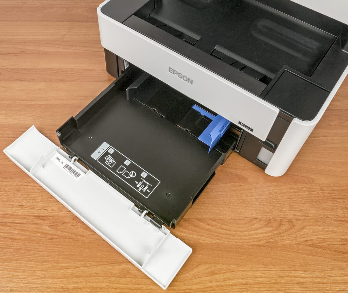 Наличие бумаги отслеживается только на этапе ее подачи при выполнении задания на печать или копирование, а до этого никакой индикации отсутствия носителей не будет. Но это не слишком большая проблема для принтера с USB-подключением.