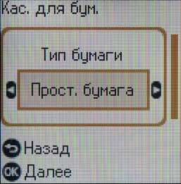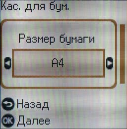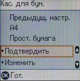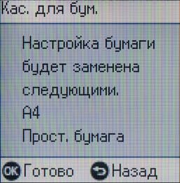 Если выдвинуть (хотя бы немного) и снова установить на место лоток, отобразится экран подтверждения формата и типа носителя, что полезно при частой их смене. Но чаще всего используется единственный вид — офисная бумага 80 г/м² А4, и тогда подобные запросы начинают мешать; их можно выключить в настройках: «Настройка принтера — Автоотобр.наст.бум».