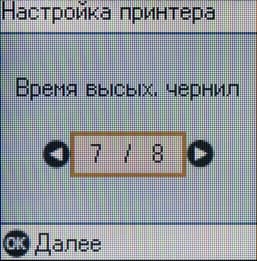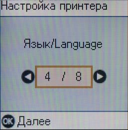 Включаем питание, первое запрашиваемое действие — выбор языка, русский тоже доступен. Примерно полминуты принтер проводит подготовительные действия (перемещает головку, вращает валы), затем на экране отображается приглашение начать инициализацию — для этого достаточно нажать кнопку «Пуск», после чего в течение десяти минут слушаем издаваемые принтером звуки, не самые тихие и приятные. На экране отображается прогресс-индикатор и сообщение про эти 10 минут, у нас процесс занял немного меньше времени: 9 минут 31 секунду. Уровень чернил в окошке чуть опустился.