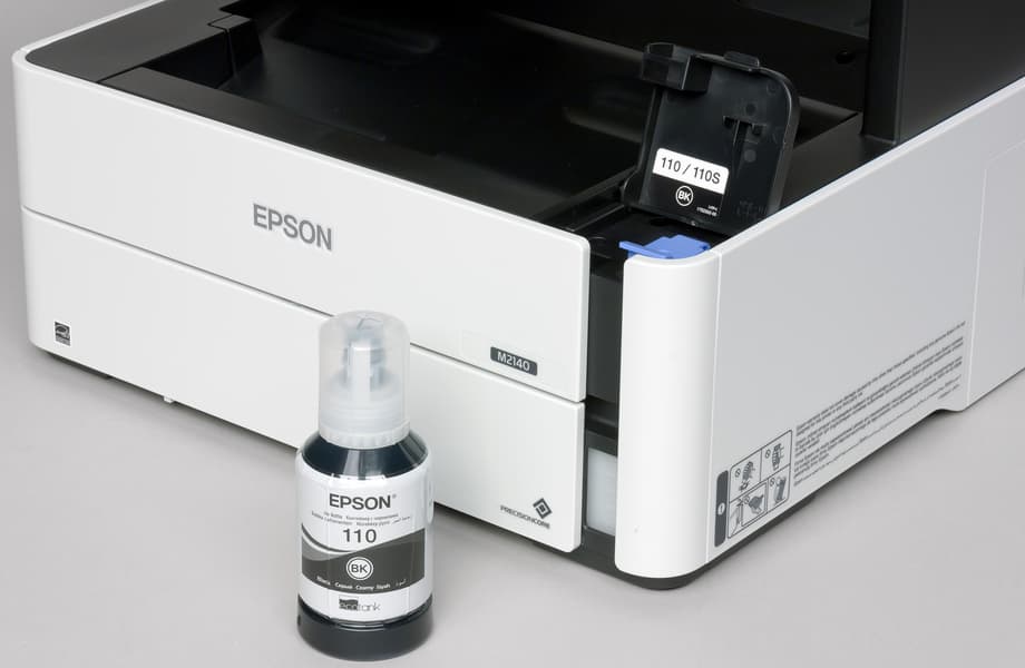 Вероятно, именно конструкцией заливной горловины в печатающем блоке и наличием клапана в контейнере и отличаются расходные материалы для М2140 — вряд ли сами чернила иные, чем у других аналогичных устройств из серии «Фабрика печати Epson».