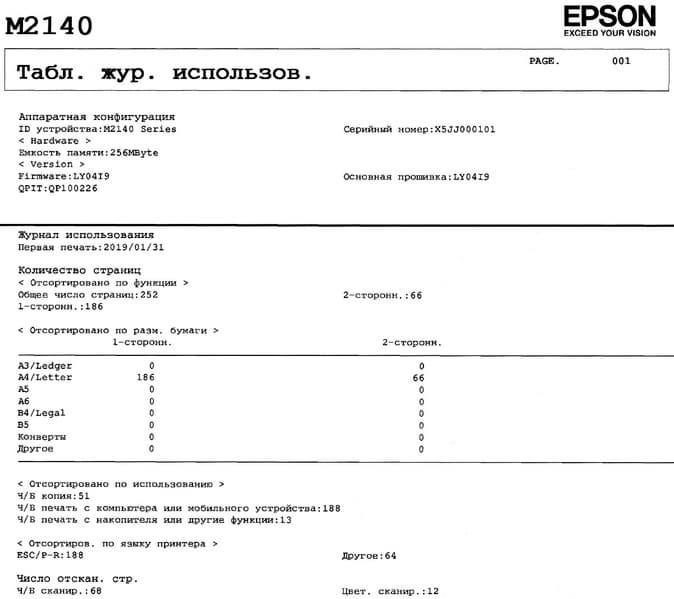 Наработку устройства можно распечатать из меню «Настройки — Счетчик копий». Сведения очень подробные, вот пример распечатки: