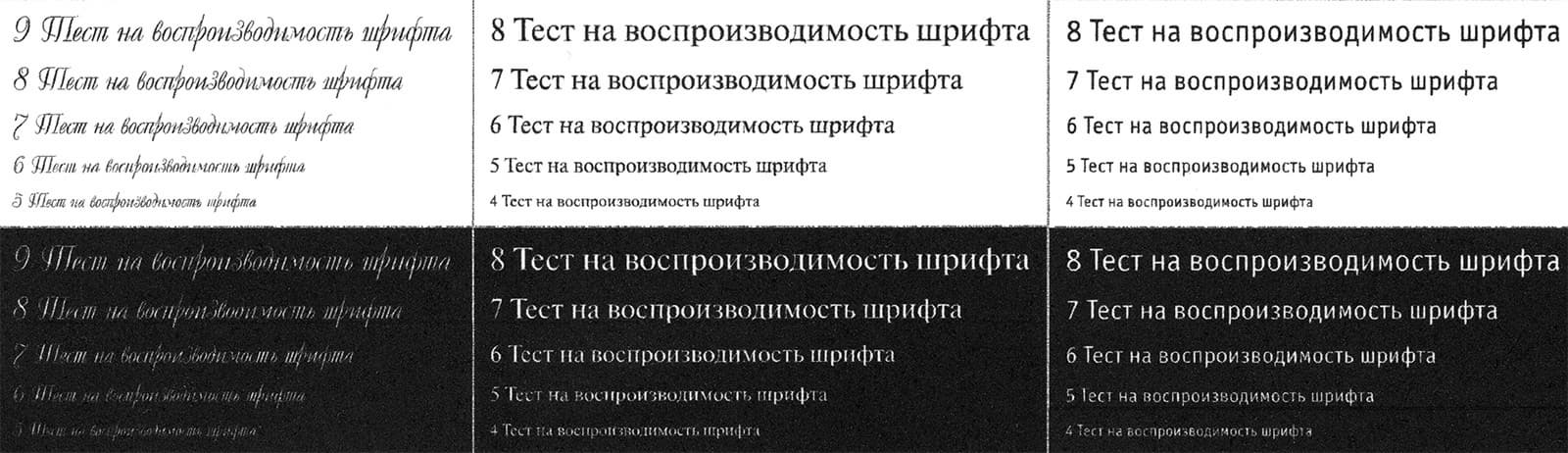 Читаемость нормальных шрифтов при обеих установках начинается с 4 кегля, вывороткой — с 5-го. Декоративные шрифты становятся более-менее разборчивыми соответственно с 6-го и 9-го кеглей.