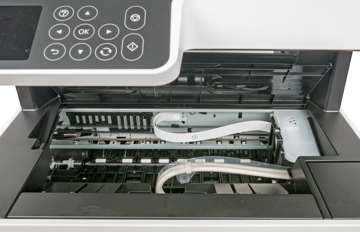 Нижняя часть приемного лотка тоже является крышкой, она закрывает отсек с печатающей головкой, механизмами ее перемещения и трубками для подачи чернил.
