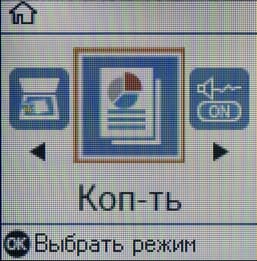 На домашней странице меню доступны пять иконок для разных функций: копирование, сканирование, управление тихим режимом, настройки и техобслуживание. Текущая функция находится в центре экрана и отображается иконкой увеличенного размера, переходы осуществляются горизонтальной прокруткой с помощью кнопок со стрелками вправо и влево, вход в меню выбранной функции — нажатием кнопки «ОК» (об этом напоминает подсказка в нижней строчке экрана).