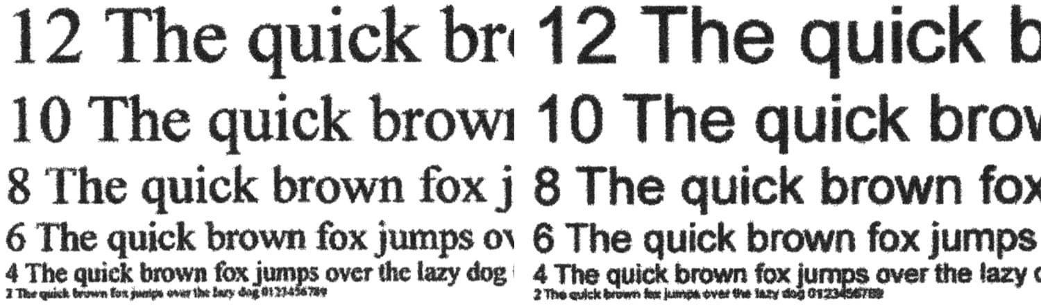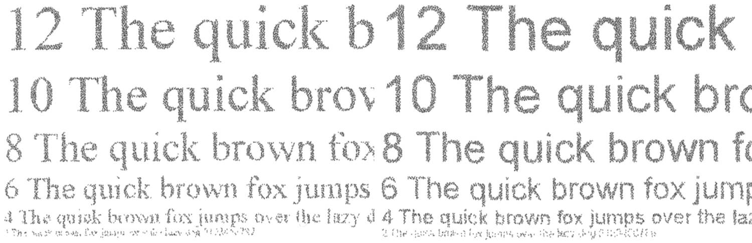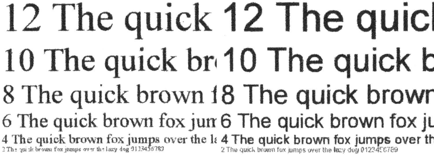 Копия получилась весьма качественной. Конечно, 2-й кегль на ней разобрать нельзя, но 4-й для обоих шрифтов читался уверенно. Заливка, пожалуй, даже чересчур плотная, поэтому можно немного скорректировать ее настройкой «Интенс.».