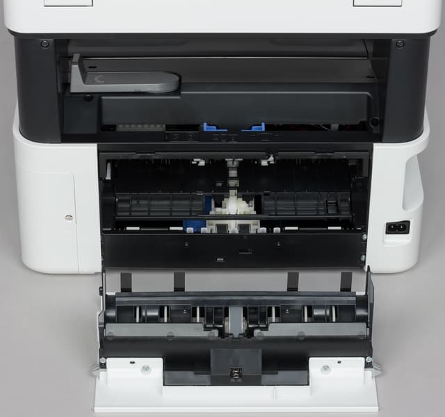 Всю ее середину занимает узел, который в инструкции назван «задней крышкой». На самом деле, это целый блок с роликами подачи, он извлекается целиком и фиксируется защелками. Вынимать его следует для извлечения застрявших носителей.