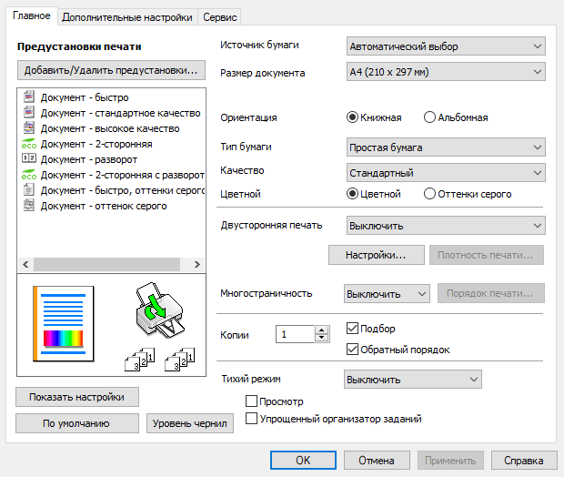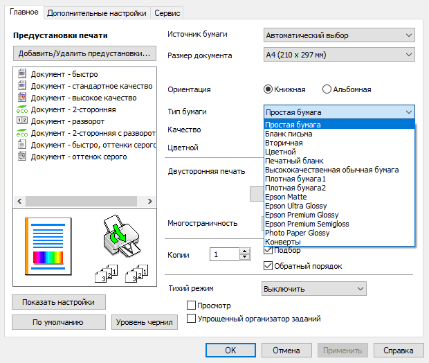 Тихий режим можно включить для любого качества, при этом скорость печати уменьшается примерно в четыре раза, зато шум снижается заметно (насколько — уточним далее). Но при выборе некоторых носителей — фотобумаги, конвертов — тихий режим становится недоступным.