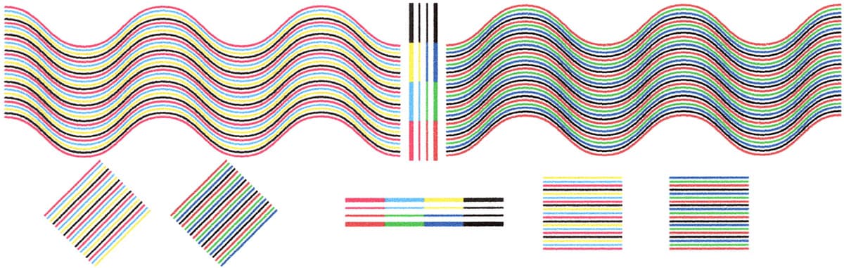 Совмещение красок по вертикали и горизонтали отличное, тонкие линии воспроизводятся хорошо, на изогнутых линиях нет перетеканий и ступенчатой структуры.