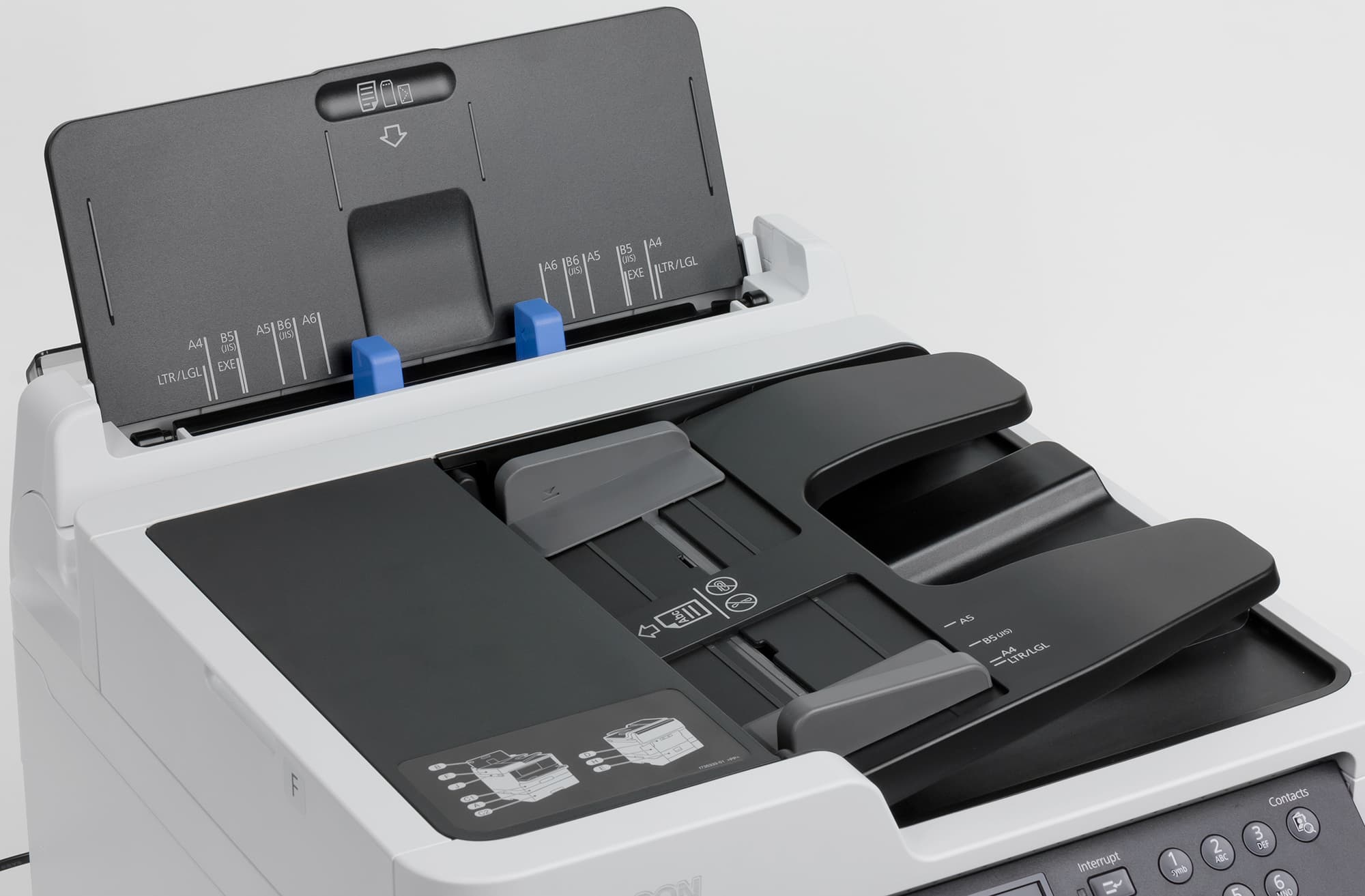 Для автоподатчика сканера мы не смогли найти официальных данных о диапазоне плотностей оригиналов, но при тестировании АПО в одно- и двустороннем режимах справлялся лишь со 120 г/м², а для 160 г/м², попытавшись втянуть первый лист из стопки, выдавал сообщение об ошибке подачи. Бумаги с промежуточной между этими двумя значениями плотностью у нас попросту не было.