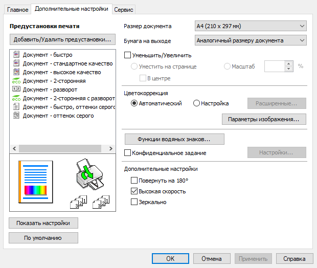 Печать в оттенках серого быстрее цветной, но отличие не столь уж значительное. Использование дуплекса снижает скорость заметно, примерно на треть.