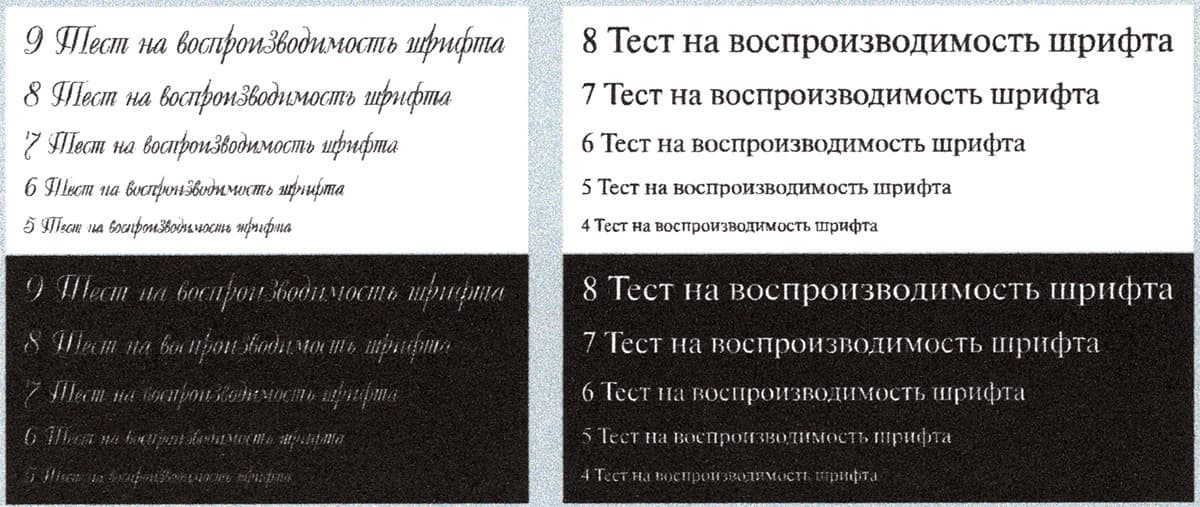 На текстовых полях при нормальной печати шрифты с засечками и без читаются от 4-го кегля, при печати вывороткой — от 6-го. Декоративный шрифт реально читается с кеглем от 6-го нормальный, с вывороткой читаемость можно назвать лишь условной даже для 8 и 9 кеглей.