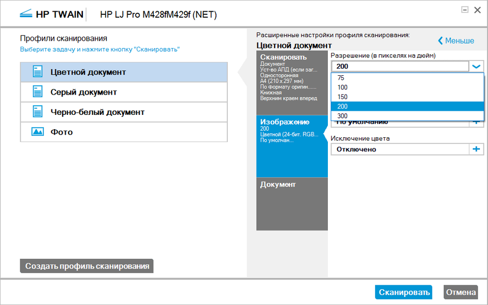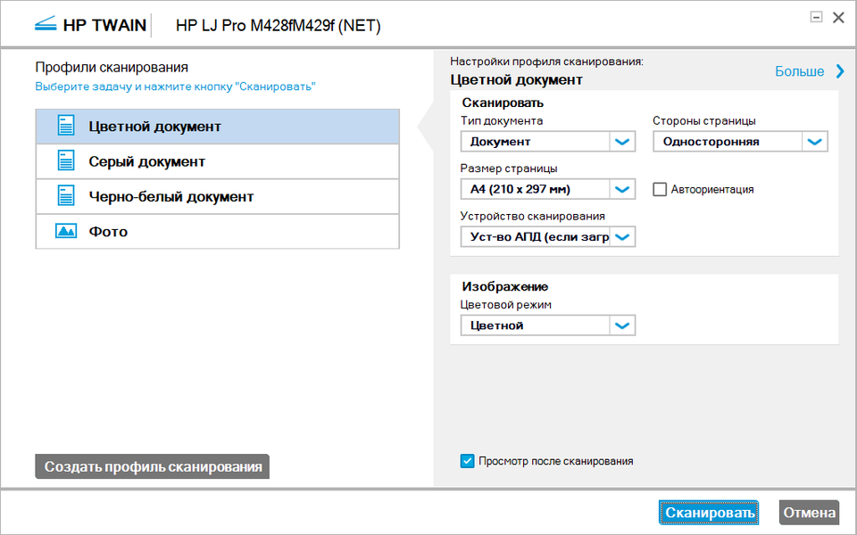 Монохромное сканирование заметно быстрее цветного, и при работе в цвете файл получается гораздо больше, что вполне понятно.