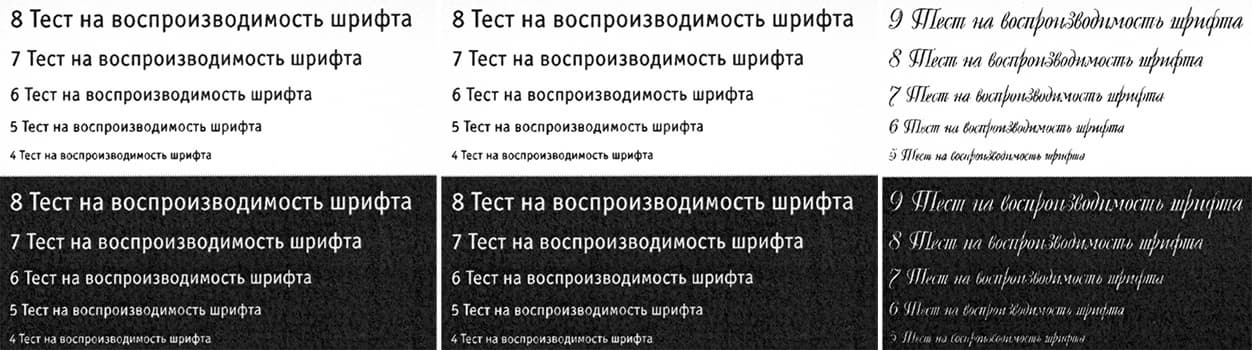 Как чаще всего и бывает, с декоративными шрифтами дело обстоит хуже: даже при нормальной печати разборчивость начинается с 7-го кегля, но и то не очень уверенная. Для выворотки читается 8-й кегль, причем с трудом.