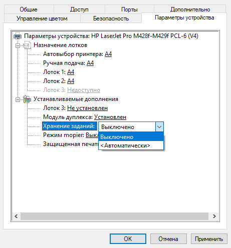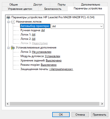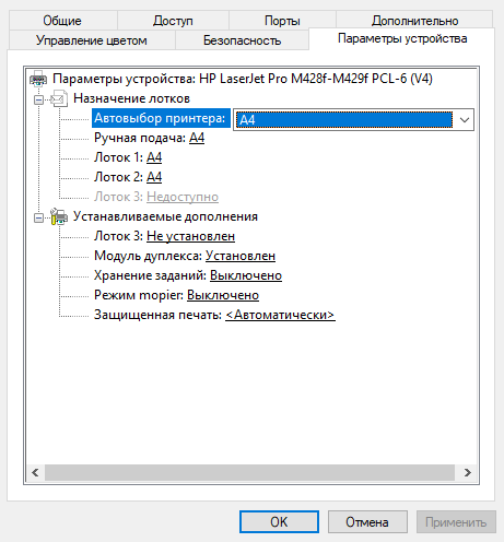 Напомним: спецификация говорит о пределе в 120 г/м² для выдвижного лотка и автоподатчика, 175 г/м² для универсального лотка. Для дуплекса значений нет, но, как сказано выше, уже при установке в драйвере «Плотная 111—130 г/м²» автоматическая двусторонняя печать выключается, листы приходится переворачивать вручную.