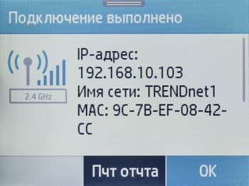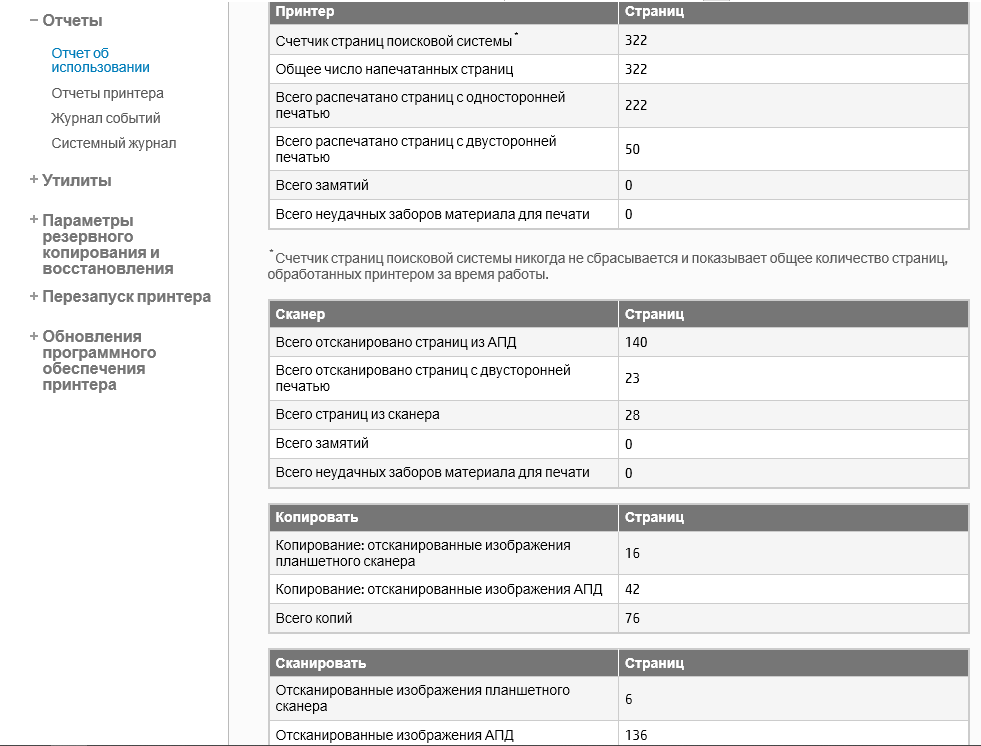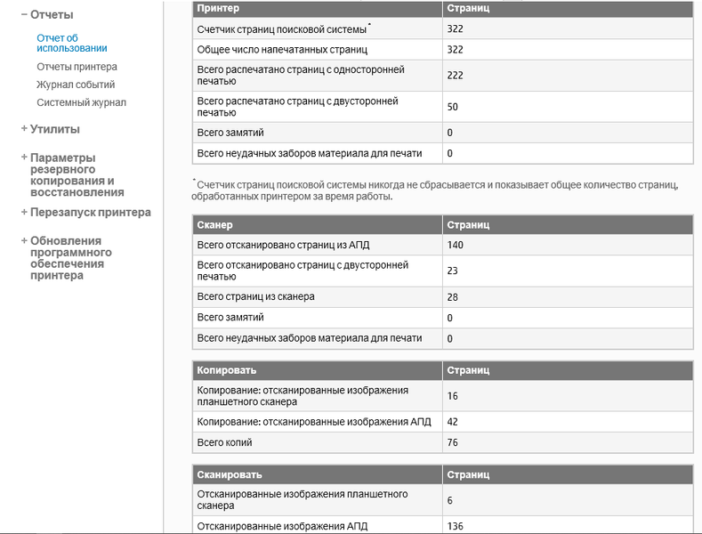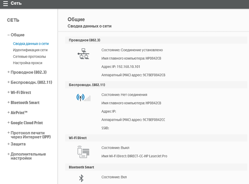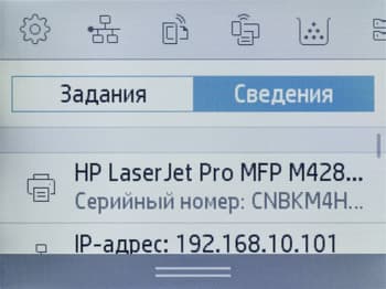 Могут отображаться и страницы с информацией о состоянии аппарата — например, о расходных материалах или о параметрах сетевого подключения: