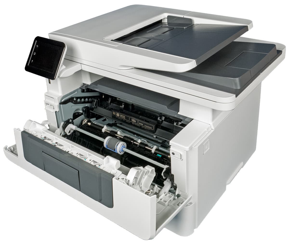 Передняя стенка вместе с универсальным лотком открывается вперед (кнопка фиксатора расположена справа на боковой стенке), за ней находятся механизмы подачи носителей — доступ к ним нужен в случаях застревания или замятия, а также картридж 59A/X. Процедура замены картриджа ничуть не сложнее, чем в сотнях подобных аппаратов, и вполне под силу любому пользователю.