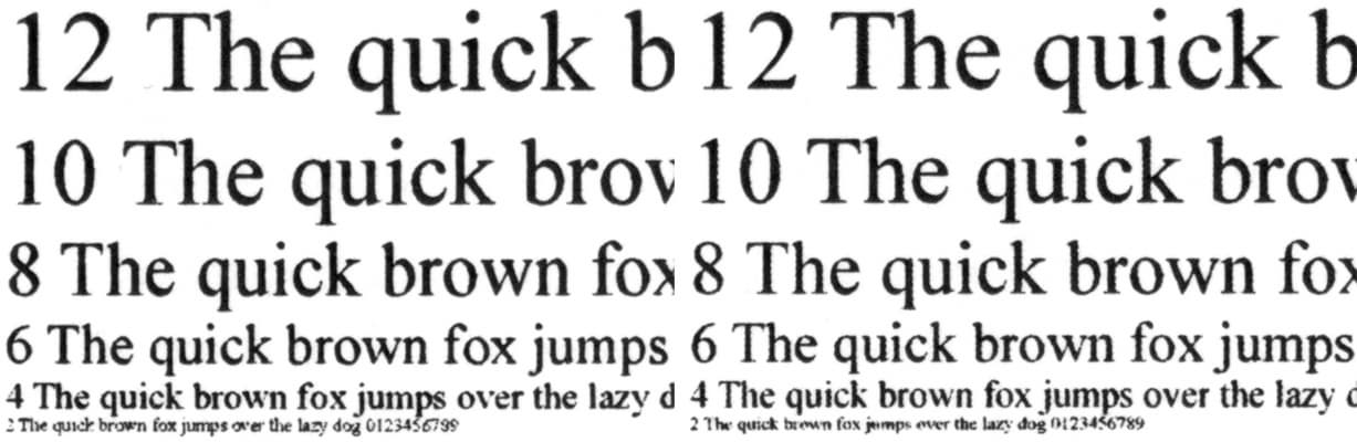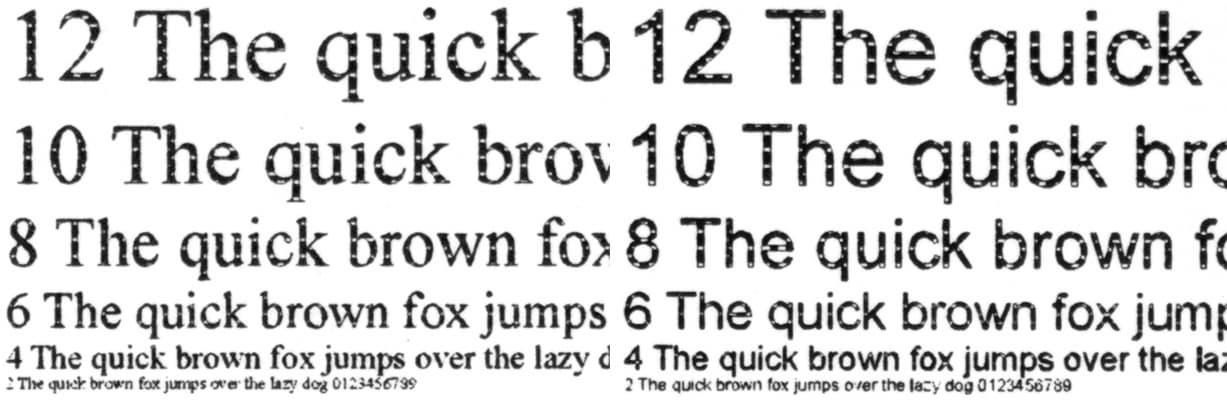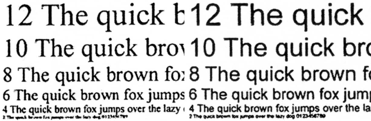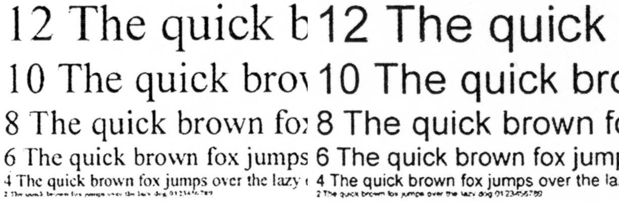 Однако читаемость при этом снижается не столь значительно, как можно было бы ожидать: 4-й кегль остается разборчивым, хотя уже и не столь уверенно. Тем не менее, из-за «сетчатости» заливки экономичный режим годится лишь для печати черновиков или совсем уж маловажных документов для внутреннего употребления.