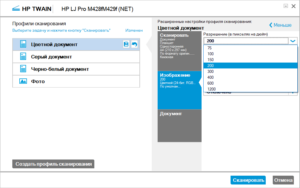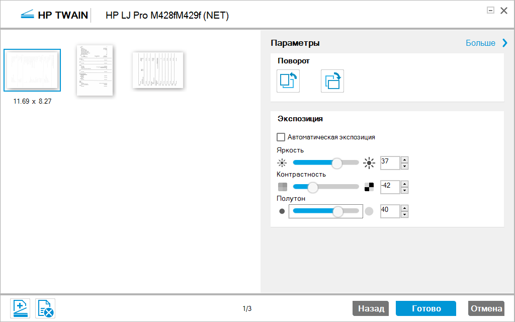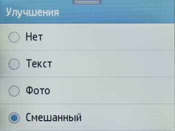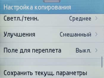 Помимо уже упоминавшегося, можно задать масштаб («Изм.разм») и поле для переплета, уточнить формат оригинала (есть и автоопределение), выбрать одну из трех градаций качества и включить улучшение для оригиналов разных типов (текст, фото, смешанный), изменить плотность. Набор параметров можно сохранить для дальнейшего использования, а также вернуть в заводские значения.