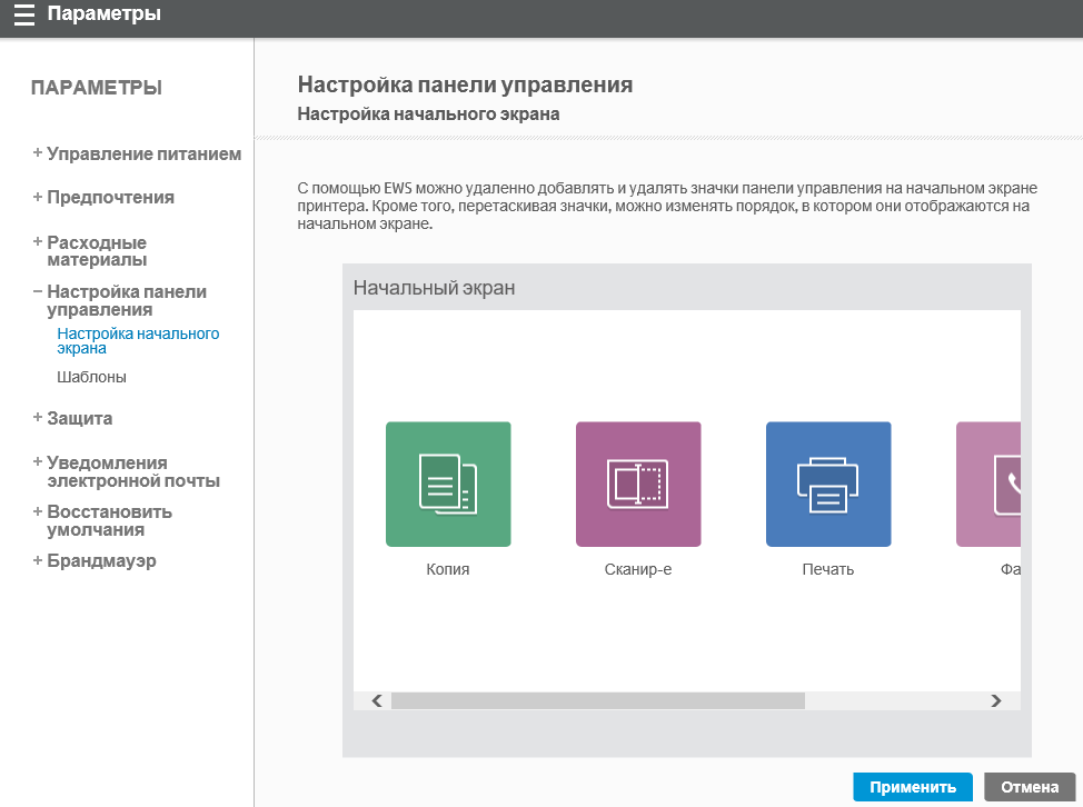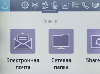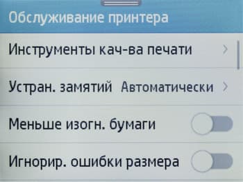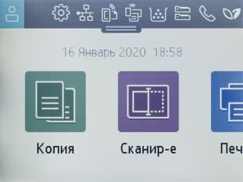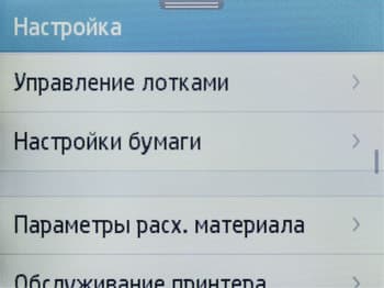 Предусмотрено разветвленное меню настроек — для сетевых подключений, печати, управления питанием, задания даты-времени, процедур обслуживания и т. д.
