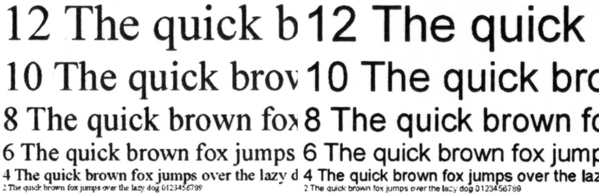 При печати передача текстовых образцов получается очень хорошей: разборчивость начинается с 4-го кегля, для шрифтов без засечек более-менее читаемым является даже 2-й кегль, с засечками такой размер читается с трудом. Заливка плотная, растр практически не заметен, что делает контуры букв ровными.