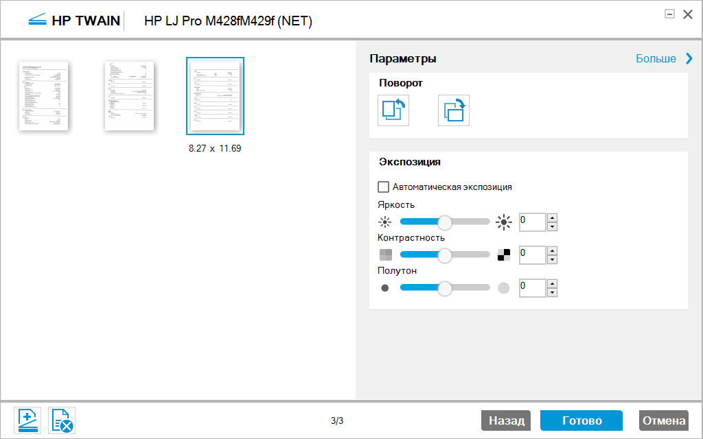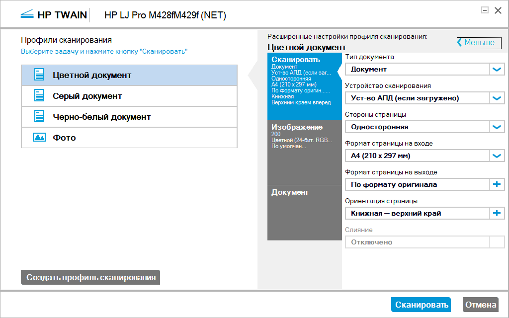 Сканирование с компьютера (драйвер TWAIN) — от старта кнопкой «Сканировать» до появления последней страницы в окне драйвера.