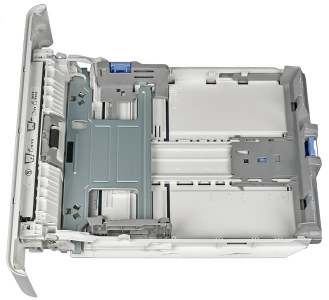 Спереди находятся и оба подающих лотка: сразу под панелью управления откидной универсальный, вмещающий до 100 листов, в самом низу выдвижной на 250 листов.
