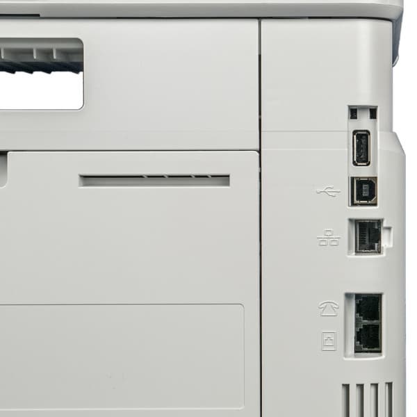 На задней стенке слева вертикальным рядом выстроились коммуникационные порты: USB 2.0 type B для подключения к компьютеру, разъемы для кабеля сети Ethernet, для подключения к телефонной линии и дополнительного телефона. Ниже расположено гнездо для кабеля питания.