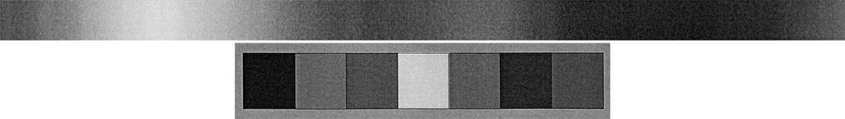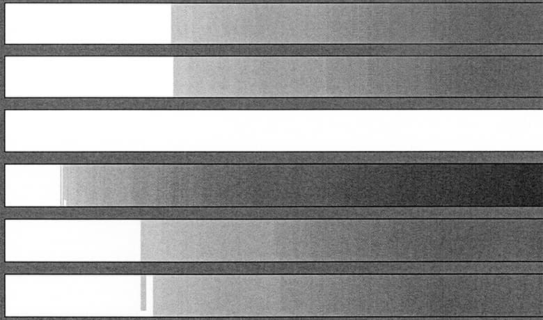 Различимость шкалы нейтральных плотностей на светлом конце отличная, от 1-2 процентов, на темном хуже — до 91%-92%. Каких-либо полос или пятен на заливках нет.
